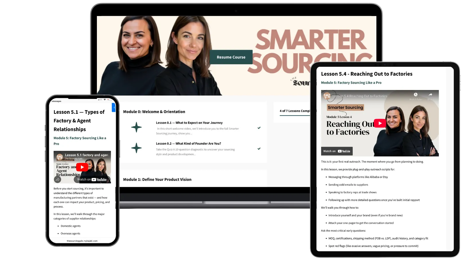 The world of manufacturing is scary, especially for a first time founder. You worry that you’ll get taken advantage of or your product idea will be stolen by a shady factory. Jackie and Erin taught me how to find real factory options, how to vet them, and what to say when I reached out to them. It took a lot of fear and guess work out of the process for me and made me feel more confident taking these steps by myself.